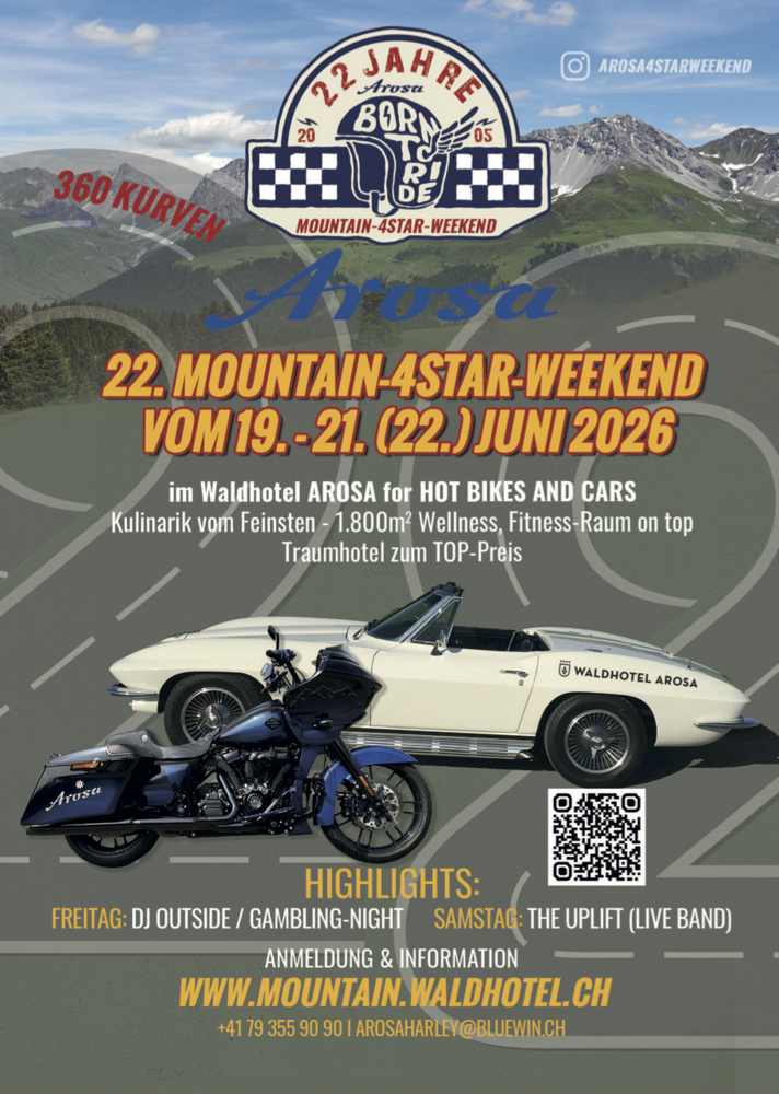 Wenn die Motoren wieder gestartet werden und die Vorfreude auf aussergewöhnliche Erlebnisse auf zwei oder vier Rädern steigt, dann ist es wieder Zeit für das Mountain-4Star-Weekend – das Event der Extraklasse im Waldhotel Arosa.